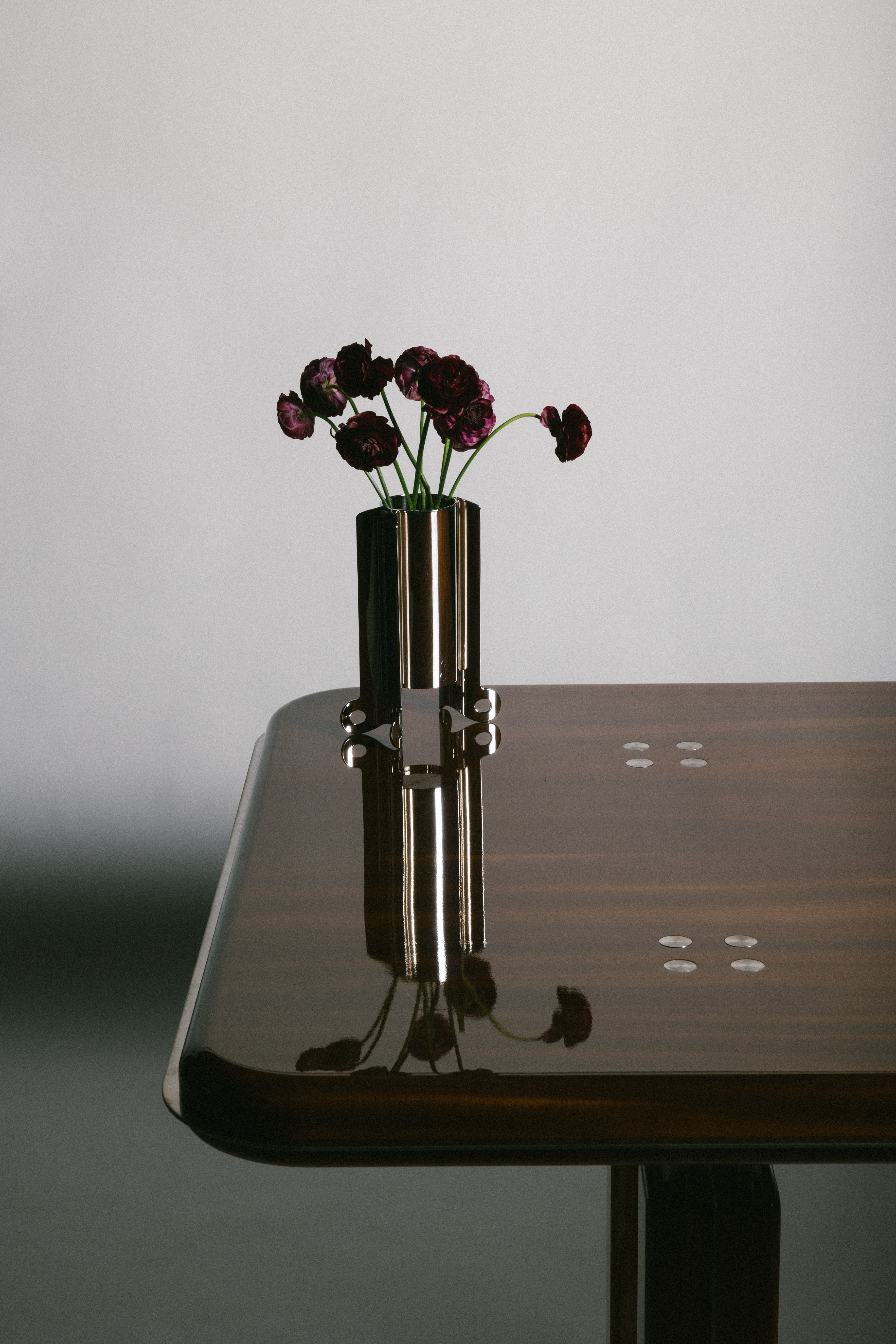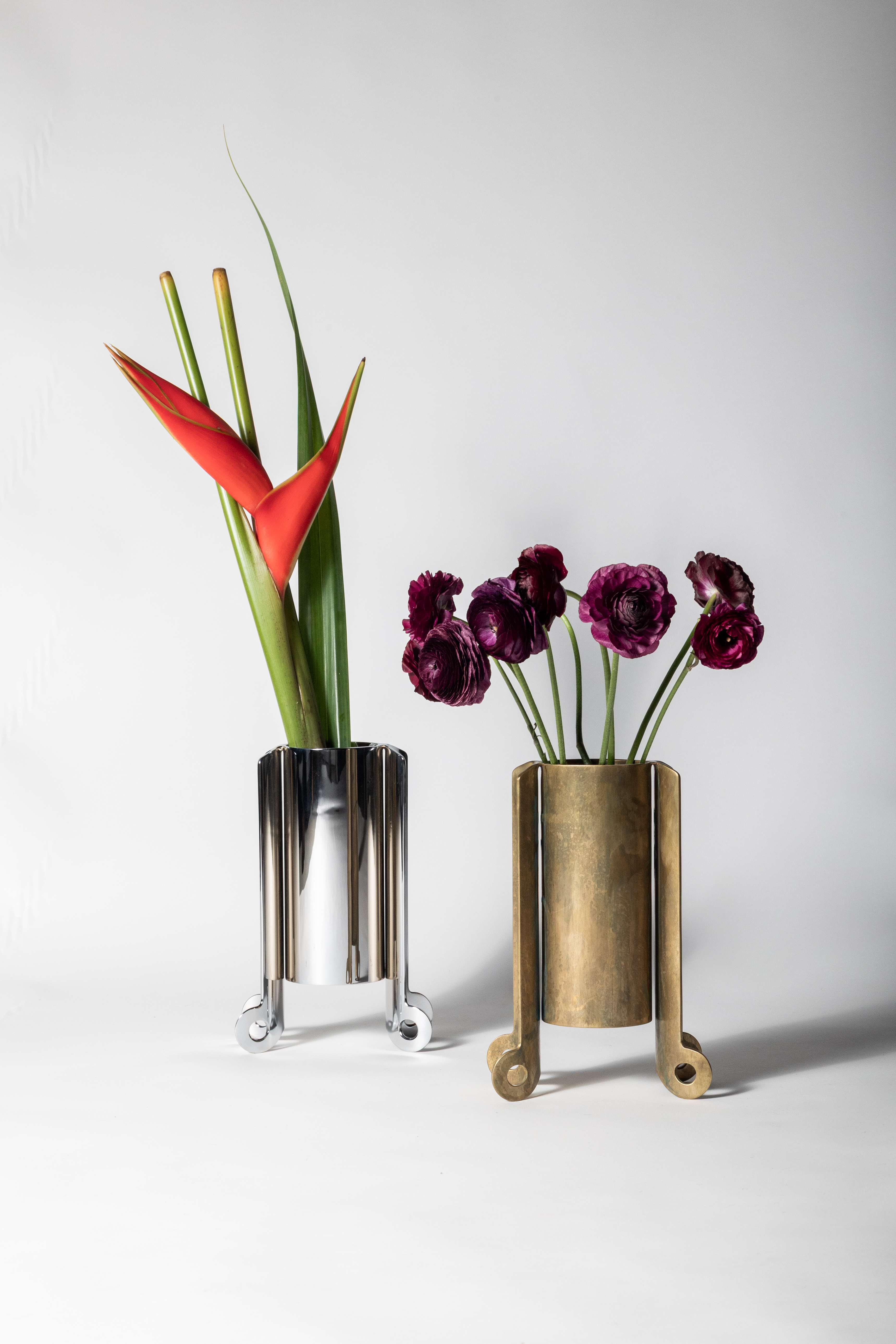Named for the way its shape is revealed in profile, the Silhouette Vase begins as a precise laser-cut form in solid brass tubing. The legs are then bent downward to create its elevated base. Available in raw brass, plated chrome, or a range of hand-applied patinas, its form is distinctly modern - yet it carries a quiet reverence for ancient ceremonial vessels. The patinas range from rich, antiqued finishes to vivid hues of oxidized blue and green, including one that recalls the iconic tones of the Statue of Liberty. No two are alike. Each piece emerges from the chemical process with its own character, a balance of unpredictability and control. Whether left empty or filled, the Silhouette Vase is designed to stand on its own.