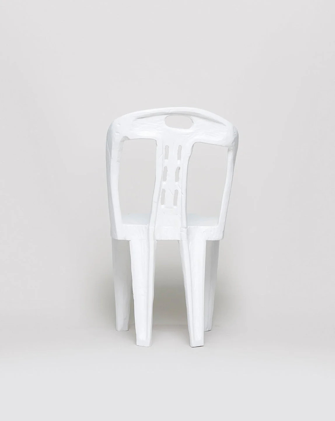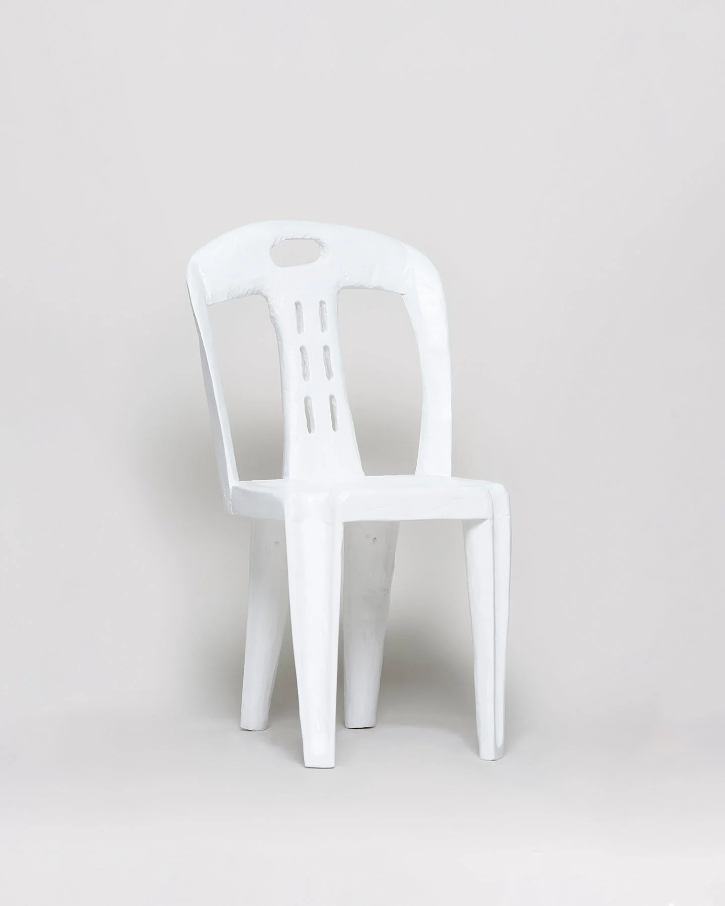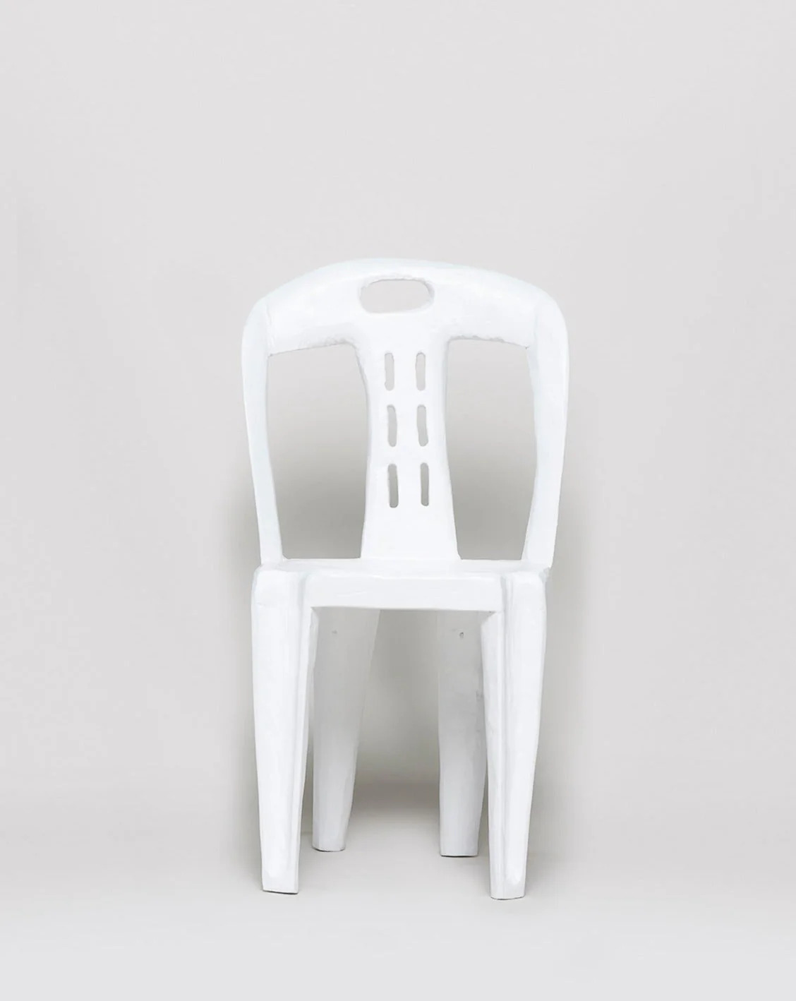 This unique artwork, carved to look like a cheap plastic garden chair, is situated within an ongoing body of work by Cameron Platter in which he 'totemifies' throwaway consumer objects and asks us to reconsider the line between the high and low, between what is trash and what is precious. To make each chair sculpture, Platter locates a worn and half-discarded plastic chair and ask its owner to exchange it for a new one. The worn chair becomes Platter's reference for his sculpture.