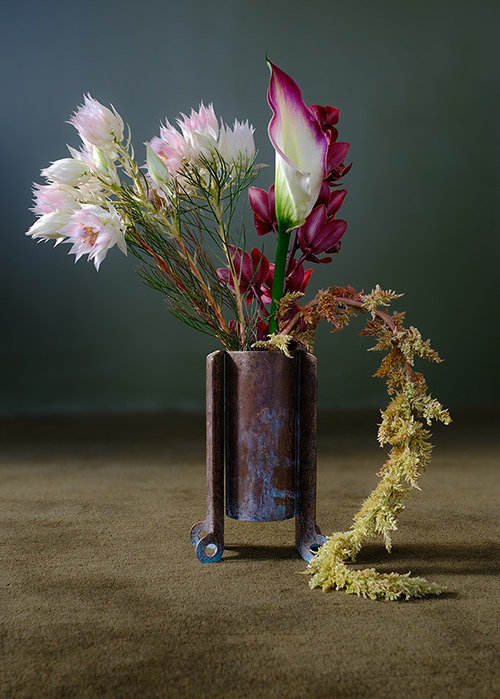 MADELINE ISAKSON — Candelabra and Vessel, Patinated Brass.